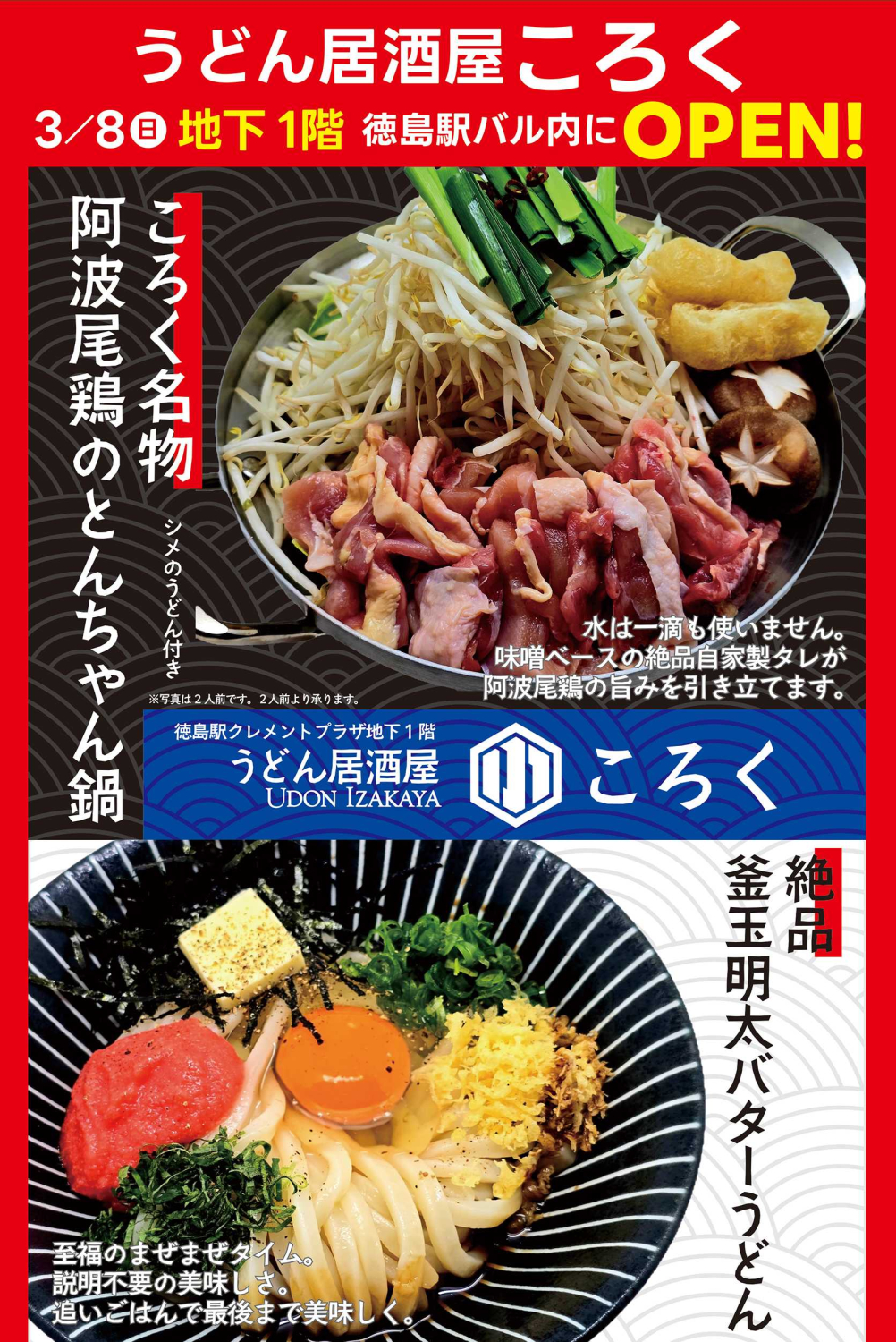 うどんをはじめ、ころく名物阿波尾鶏のとんちゃん鍋など当店しか食べられないメニューを取り揃えております!!